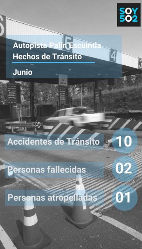 Brenda Santizo, portavoz del Departamento de Tránsito de la PNC, explicó que en lo que va de junio han registrado 13 hechos de tránsito en la autopista Palín-Escuintla, en los cuales han fallecido dos personas y una fue atropellada.