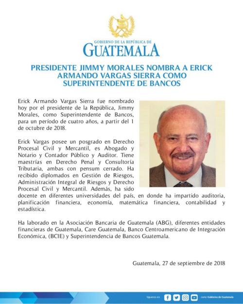 El presidente Jimmy Morales nombró al abogado Erick Armando Vargas Sierra como nuevo titular de la Superintendencia de Bancos (SIB).