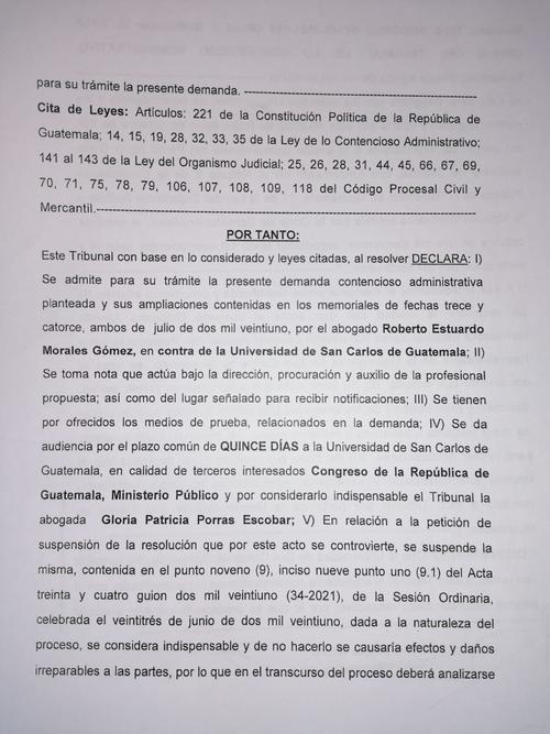 La Sala Quinta de lo Contencioso Administrativo admitió tramitar la demanda y la primera resolución fue suspender el punto 9.1 del acta 34-2021 donde el CSU no acepta el recurso de revisión de Morales.