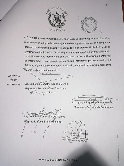 La Sala Quinta de lo Contencioso Administrativo fue presidida por el magistrado Guillermo Demetrio España Mérida, quien razonó su voto y los vocales Miguel Enrique Catalán Orellana y Giovanni Francisco Soto Santos.