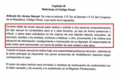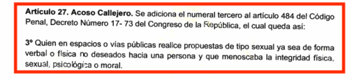 Hasta ahora, en Guatemala no hay una ley que penalice el acoso. En el artículo 173 del Código Penal solo están tipificadas la violación y agresión sexual.