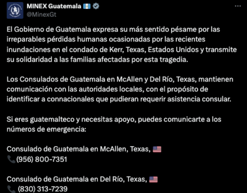 Además, dieron a conocer que los consulados de Guatemala en McAllen y Del Río, Texas, "mantienen comunicación con las autoridades locales, con el propósito de identificar a connacionales que pudieran requerir asistencia consular".
