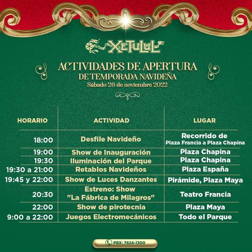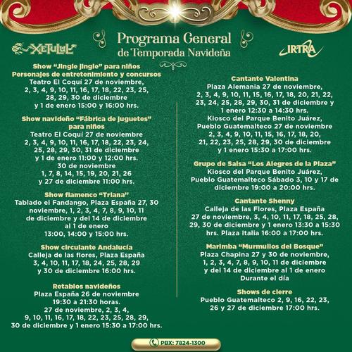 El Irtra ha publicado en sus redes las diferentes actividades que estará realizando hasta el uno de enero 2023 y contará con conciertos, shows navideños, de flamenco y retablos navideños, entre otros. La inauguración es este sábado a partir de las 18:00 horas con un desfile navideño que recorrerá la plaza Francia a la Plaza Chapina.