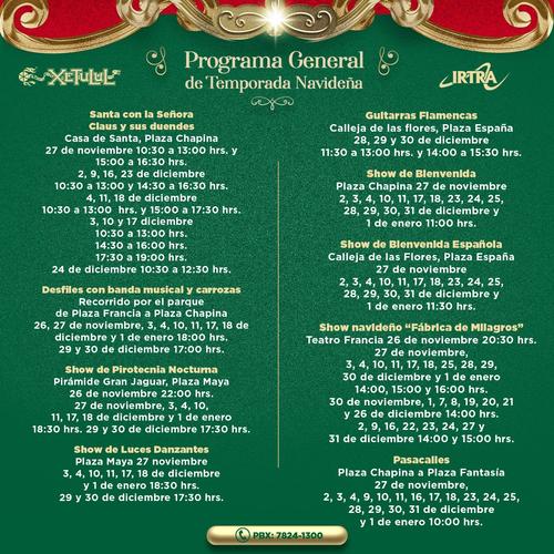 Instituto de Recreación de los Trabajadores de la Empresa Privada de Guatemala (Irtra) ha preparado una serie de actividades para poder disfrutar de la temporada navideña, desde este sábado 26 de noviembre, el parque de diversiones de Xetulul ubicado en el departamento de Retalhuleu.