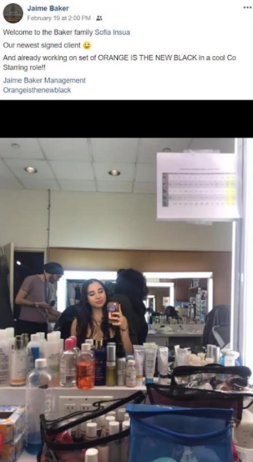 En el mensaje, la actriz aparece en el área de maquillaje, mientras que Baker indicó: "¡Bienvenida a la familia Sofia Insua! Quien actualmente está trabajando en el set Orange Is The New Black en el papel de coprotagonista".