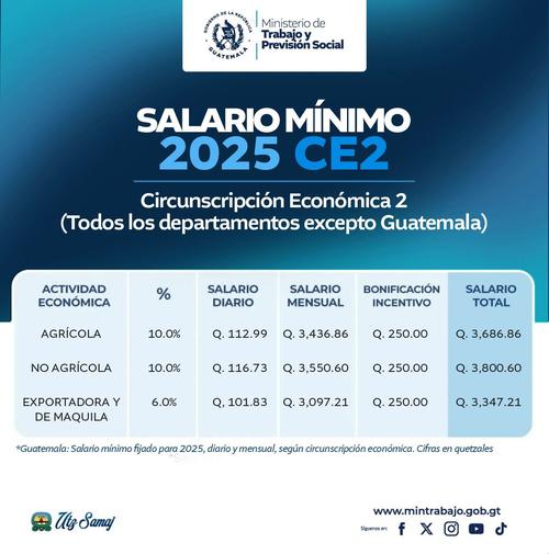 Hace cuatro días, cuando Arévalo anunció la mejora salarial, se dio a conocer que el nuevo sueldo mínimo para la actividad exportadora y de maquila en la ciudad capital y otros municipios de Guatemala sería de Q107.79 diarios y alcanzaría los Q3,528.59 al mes, incluyendo la bonificación incentivo.