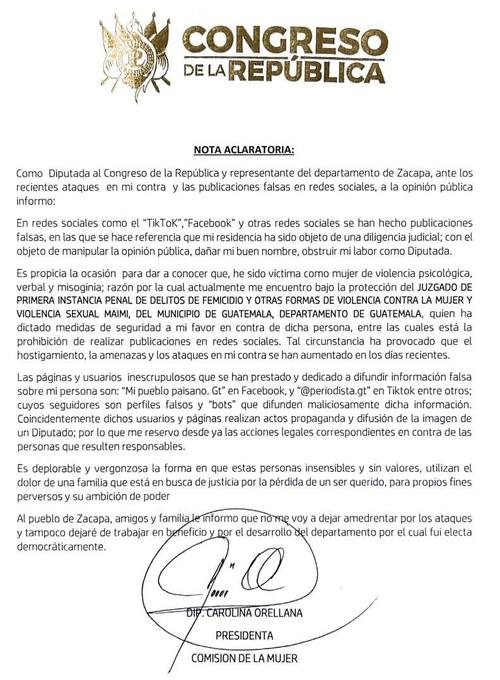 En el documento que compartió, la parlamentaria indica que, como parte de las medidas de protección que le fueron concedidas, su compañero no puede hacer publicaciones en Internet refiriéndose a ella.