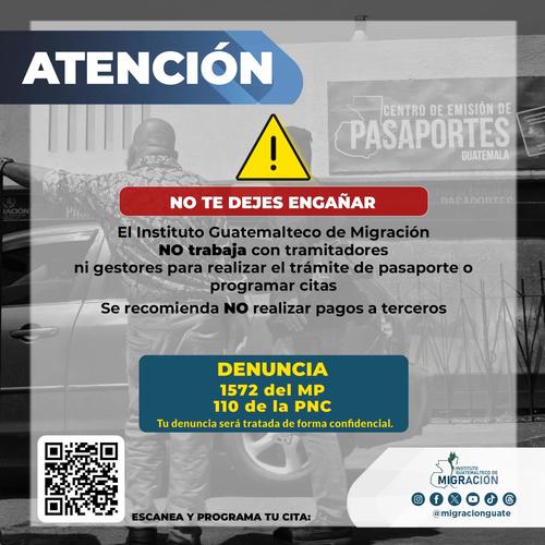 "El Instituto Guatemalteco de Migración NO trabaja con tramitadores ni gestores para realizar el trámite de pasaporte o programar citas", indica la publicación.