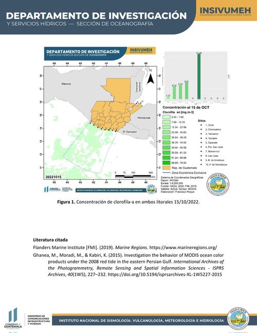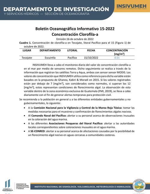 El Insivumeh publicó en su boletín oceanográfico el hallazgo de concentraciones de clorofila-a por encima de los valores normales en Tecojate, Escuintla. Hasta 7 mg/m3 es considerado normal y el estudio reporta 8 mg/m3.
