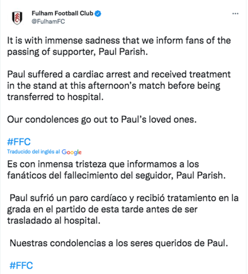 “Es con una inmensa tristeza que informamos a los fanáticos del fallecimiento del seguidor Paul Parish”, indicó el Fulham en un comunicado. “Nuestras condolencias y los pensamientos de todos en el Fulham Football Club están con la familia, amigos y seres queridos de Paul”, agregó el club.