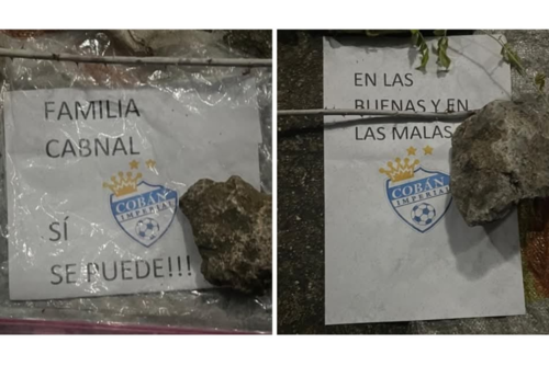Otro cartel, prensado con una piedra, muestra el mensaje: "En las buenas y en las malas", mientras que en otra hoja se inscribe "Familia Cabnal". Los aficionados no se limitaron al uso de papel, ya que también utilizaron ramas y rocas para marcar sus lugares y asegurar su espacio en el estadio.