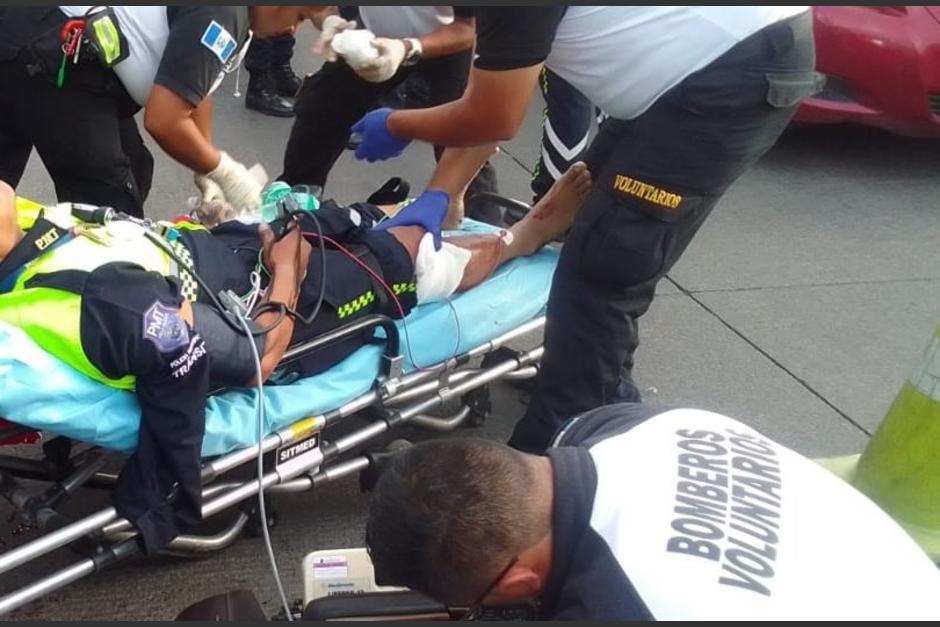 Los socorristas detallaron que el policía de tránsito fue trasladado hacia el Instituto Guatemalteco de Seguridad Social (IGSS) y que presentaba heridas en las extremidades.