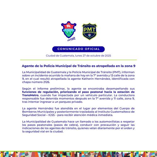 La Municipalidad de Guatemala se pronuncia por el incidente donde una agente PMT fue atropellada por una conductora en zona 9.