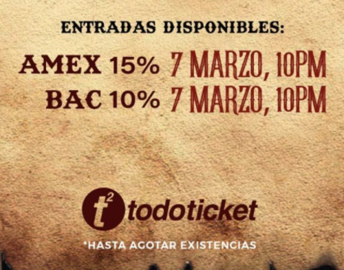 Los beneficios en este caso serán para quienes cuenten con tarjeta de American Express podrán adquirir sus entradas con un descuento del 15% de descuento, mientras que, quienes tengan tarjetas de débito y crédito de BAC Credomatic, obtendrán un 10% de descuento.