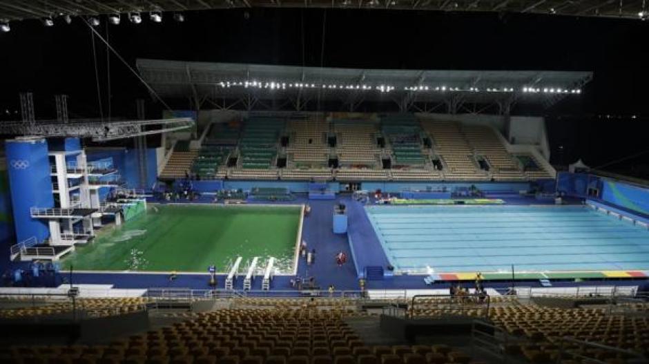 El contraste era perceptible en el momento de la prueba femenina de clavados de plataforma a 10 metros el martes, entre el agua verde en la que caían las clavadistas y el azul claro de la piscina vecina del waterpolo.