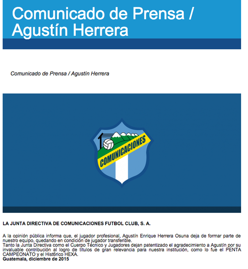 El delantero mexicano, Agustín Herrera, se mostró sorprendido, tras quedar fuera de Comunicaciones y dijo que en sus planes no estaba dejar la institución ya que tenía un contrato vigente.