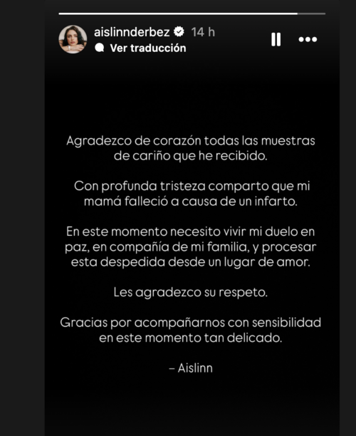 Ante varias especulaciones sobre la posible causa de muerte, Aislinn se pronunció y reveló que su madre falleció a causa de un infarto.