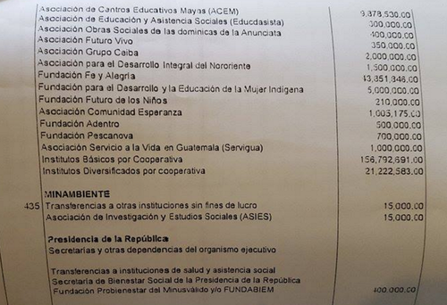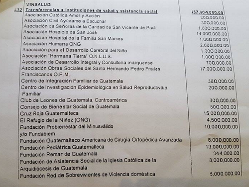 Los ministerios que apoyarán a más fundaciones y ONGs son Salud, con 42 y Educación, con 17. Mientras tanto, en el listado que se hizo público este viernes en el Congreso se incluyen 17 millones de quetzales del Ministerio de Economía que aún no se ha decidido a que organizaciones irán.
