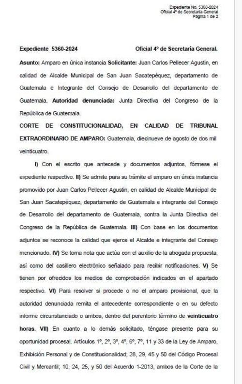 Se trata del jefe edil de San Juan Sacatepéquez, Juan Carlos Pellecer, cuyo expediente ya fue admitido por el citado tribunal.