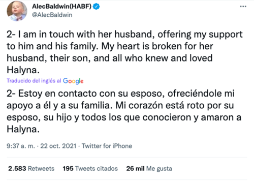 “No hay palabras para transmitir mi conmoción y tristeza por el trágico accidente que se ha cobrado la vida de Halyna Hutchins, esposa, madre y colega profundamente admirada”, señaló el actor de 63 años en su cuenta de Twitter. “Estoy cooperando plenamente con la investigación policial para abordar cómo ocurrió esta tragedia y estoy en contacto con su marido, ofreciéndole mi apoyo a él y a su familia. Mi corazón está roto por su marido, su hijo y todos los que conocían y amaban a Halyna”, concluyó Baldwin.