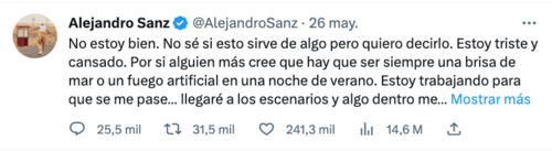 "No estoy bien. No sé si esto sirve de algo, pero quiero decirlo. Estoy triste y cansado, por si alguien más cree que hay que ser siempre una brisa de mar o un fuego artificial en una noche de verano. Estoy trabajando para que se me pase, llegaré a los escenarios y algo dentro me dirá qué hacer pero a veces no quiero ni estar, literalmente solo lo por ser sincero, por no entrar al ruido inútil, sé que hay gente que se siente así, si te sirve, yo me siento igual", escribió.