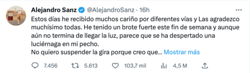 "Estos días he recibido mucho cariño por diferentes vías y las agradezco muchísimo todas, he tenido un brote fuerte este fin de semana y aunque aún no termina de llegar la luz, parece que se ha despertado una luciérnaga en mi pecho, no quiero suspender la gira porque creo que con la ayuda correcta y un poco de comprensión y apoyo en los shows lo vamos a sacar adelante, además creo que encerrarme no es buena idea, gracias por el calorcito, vamos a por el día de mañana, el sol está de camino".