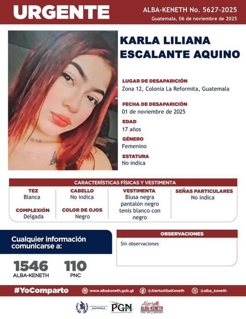 La Alerta Alba Keneth fue activada tras la desaparición de Karla Liliana Escalante Aquino, una adolescente de 17 años, quien fue vista por última vez el 1 de noviembre en la zona 12.