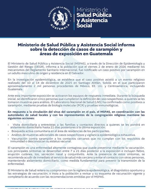 En el comunicado informa que, según la investigación epidemiológica realizada, el hombre asistió a un evento religioso realizado del 10 al 14 de diciembre de 2025 en Santiago Atitlán, Sololá.