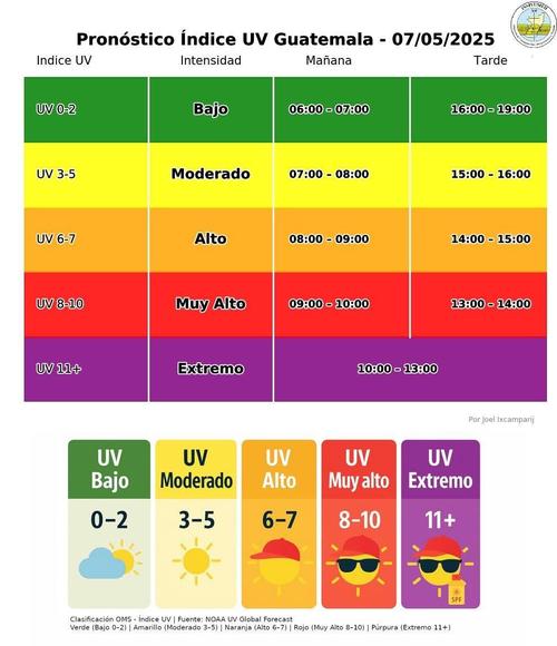 El Instituto Nacional de Sismología, Vulcanología, Meteorología e Hidrología (Insivumeh) recomienda a la población protegerse de los rayos UV este 7 de mayo de 2025 y comparte el Índice UV de Guatemala con los horarios de mayor radiación.