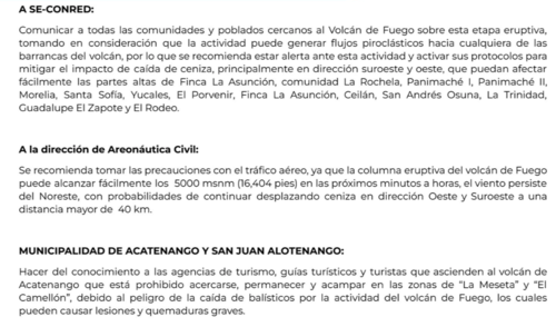 Además, el ente científico emitió recomendaciones a las comunidades cercanas por medio de la Coordinadora Nacional para la Reducción de Desastres (Conred) y también a la Dirección General Aeronáutica Civil para que tome las precauciones correspondientes en el tráfico aéreo debido a la ceniza.