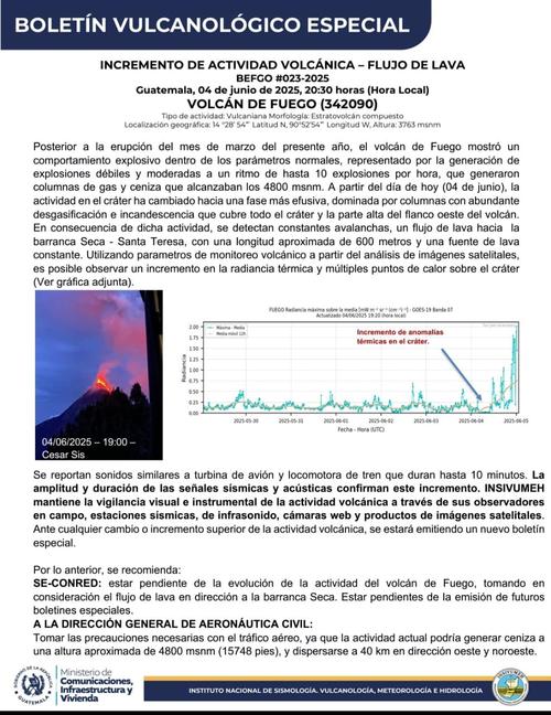 Por medio de un boletín vulcanológico especial, el Instituto Nacional de Sismología, Vulcanología, Meteorología e Hidrología (Insivumeh) informó sobre el incremento en la actividad del volcán de Fuego, este 4 de junio.