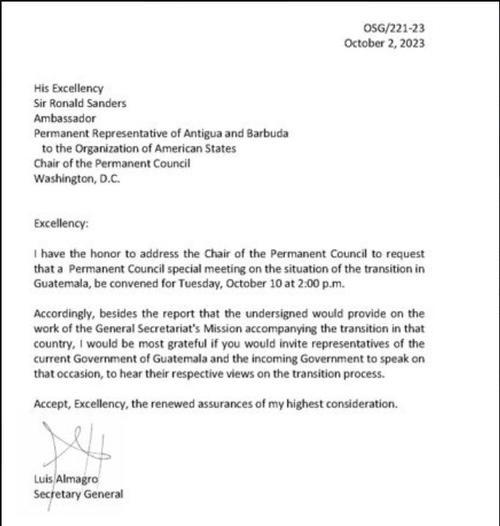 Es de recordar que el jefe de la Organización estuvo como observador en dos de los encuentros que sostuvieron Giammattei y Arévalo en las primeras semanas de septiembre.
