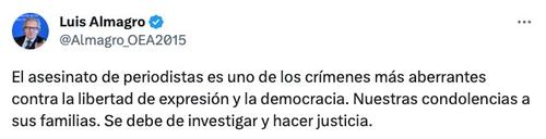 El pronunciamiento de Almagro se da después de que el relator especial para la Libertad de Expresión de la Comisión Interamericana de Derechos Humanos, Pedro Vaca, condenara el asesinato de los comunicadores.