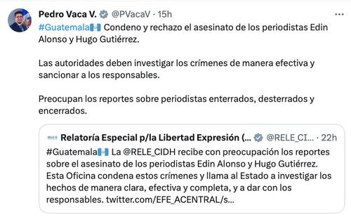 Vaca externó su preocupación por los reportes sobre el asesinato de los periodistas y escribió en la red social X (antes Twitter): "Esta Oficina condena estos crímenes y llama al Estado a investigar los hechos de manera clara, efectiva y completa, y a dar con los responsables."