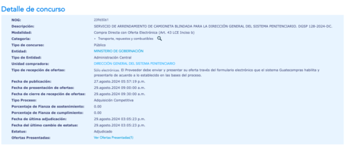 El 27 de agosto pasado, el Sistema Penitenciario publicó en el Portal de Guatecompras un proceso de adquisición del servicio de arrendamiento de una camioneta blindada para uso de la Dirección General de esa Institución.
