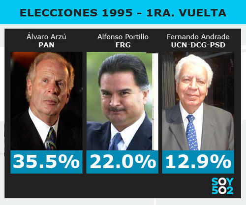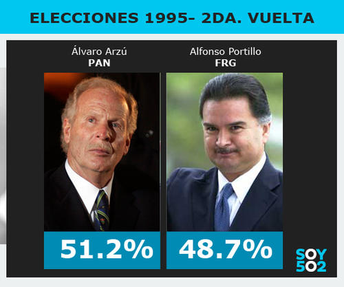 En las Elecciones Generales de 1995, Álvaro Arzú Irigoyen ganó la contienda con un cerrado porcentaje en la segunda vuelta electoral, frente a un Alfonso Portillo que lo seguía de cerca.
