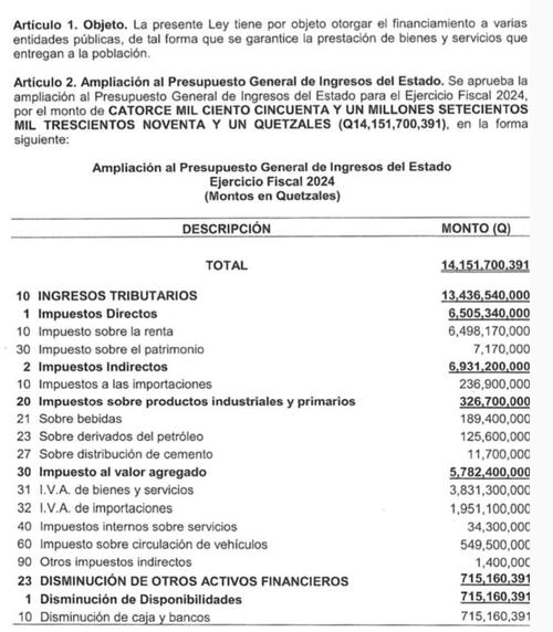 Esta es por Q14,151.77 millones y, según el Decreto 17-2024, el 94.9% de los recursos se obtendrían de la recaudación de impuestos, mientras que el otro 4.1% serán saldos de caja.