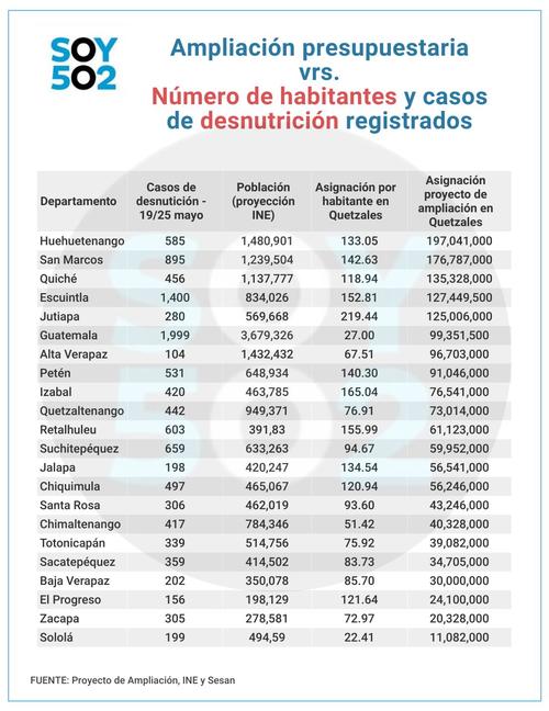 Soy502 comparó la distribución geográfica de los recursos a los Codedes en el proyecto de ampliación presupuestaria, con relación al número de habitantes de cada municipio, así como con los casos de desnutrición aguda en niños de 5 años hasta la semana epidemiológica 21 (del 19 al 25 de mayo), para determinar si la asignación se realizó para beneficiar a los ciudadanos. Sin embargo, no tiene ninguna relación.