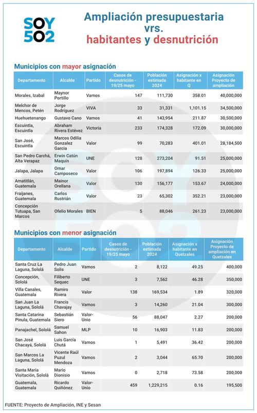 Hacer una comparación entre la población, los casos de desnutrición crónica y la asignación presupuestaria se torna aún más confusa cuando se compara entre los 340 municipios, ya que Morales, en Izabal, es el que más recursos recibiría con un total de Q40 millones, cuando tiene una población estimada de 111,730 y 147 casos de desnutrición aguda identificados.