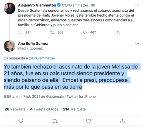 "Desde Guatemala condenamos y rechazamos el cobarde asesinato del presidente de Haití, Jovenel Moïse. Este terrible hecho atenta contra el orden democrático, enviamos nuestras más sinceras condolencias a su familia, al Gobierno y pueblo haitiano", dijo el presidente en su cuenta.