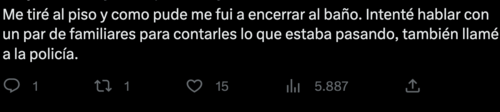 "Me tiré al piso y como pude me fui a encerrar al baño. Intenté hablar con un par de familiares para contarles lo que estaba pasando. También llamé a la policía", explicó.