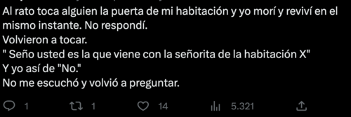 Luego, alguien tocó a su puerta. Al no responder, insistieron. "Seño, ¿usted es la que viene con la señorita de la habitación? Y yo así de ¡NO! - No me escuchó y volvió a preguntar".