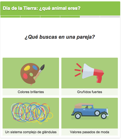 El cuestionario cuenta con cinco preguntas sobre tus costumbres, hábitos o temperamentos. Al terminar de responder, te identifica con una especie animal.