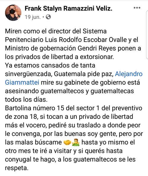 Además, era un crítico del Gobierno del presidente Alejandro Giammattei. En múltiples ocasiones denunciaba a través de su cuenta de Facebook actos de corrupción en las cárceles del país, incluso responsabilizó a las autoridades si algo le pasaba.