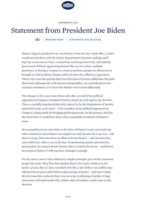Por medio de una extensa carta, el gobernante norteamericano explicó las razones que lo llevaron a conceder el perdón a su hijo, quien, señaló, ha sido "procesado de manera selectiva e injusta".