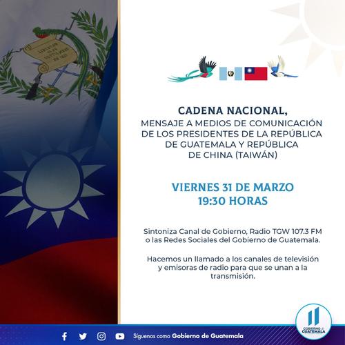 El Gobierno de Guatemala anunció que habrá Cadena Nacional la noche de este viernes 31 de marzo a las 19:30 horas, según se informó en una publicación.