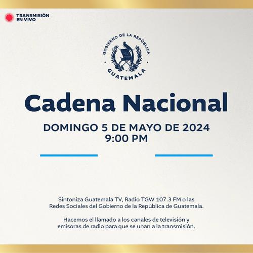 La secretaría de Comunicación Social de la Presidedencia informó que este domingo 05 de mayo, el presidente Bernardo Arévalo hablará en cadena nacional.