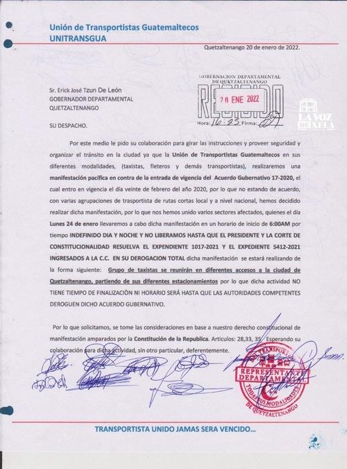 Sin embargo, en el documento no detallan las ubicaciones de concentración, únicamente detallan que un grupo de taxistas saldrá de Quetzaltenango, partiendo desde sus respectivos estacionamientos.