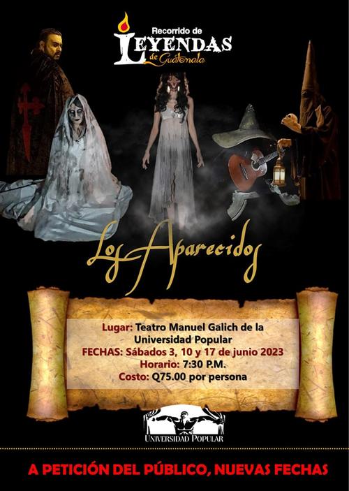 La presentación teatral Los Aparecidos amplía funciones dado el éxito obtenido. El espectáculo estará disponible durante el mes de junio en el teatro Manuel Galich de la Universidad Popular con la que se hace un recorrido por las leyendas de Guatemala.