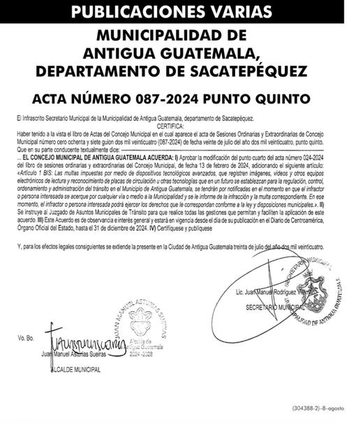 - "Las multas impuestas por medio de dispositivos tecnológicos avanzados, que registren imágenes, videos y otros equipos electrónicos de lectura y reconocimiento de placas de circulación u otras tecnologías que en un futuro se establezcan para la regulación, control, ordenamiento y administración del tránsito en el Municipio de Antigua Guatemala", indica el acta.